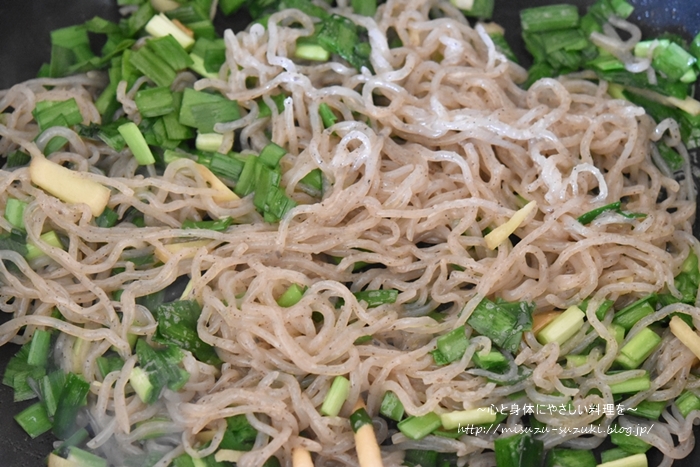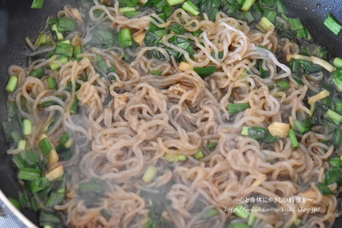 糸こんにゃくを乾煎りにして、後はにらと合わせダレを加えて、