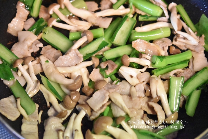 豚バラ薄切り肉を入れ焼き色がつくまで焼き、しめじと小松菜の芯を入れサッと炒める。