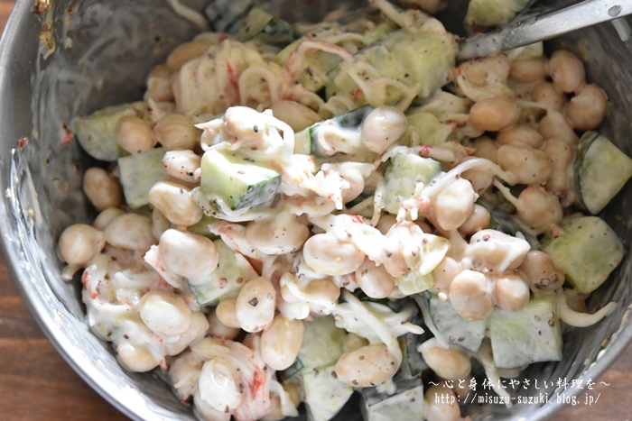 今日のレシピは、大豆ときゅうりの粒マスタードサラダです。