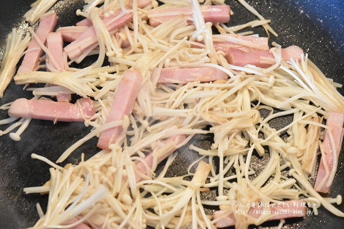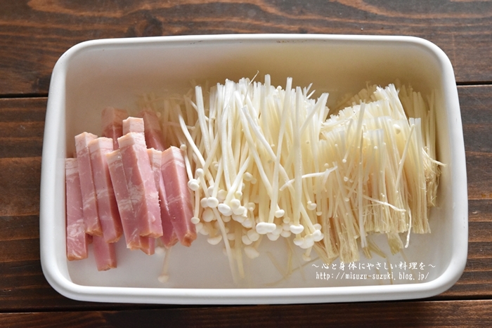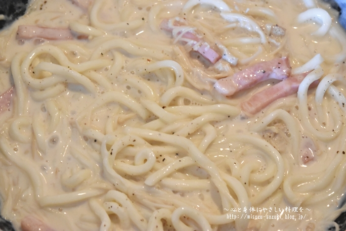 今日のレシピは、ベーコンとえのきのカルボナーラ風うどんです。