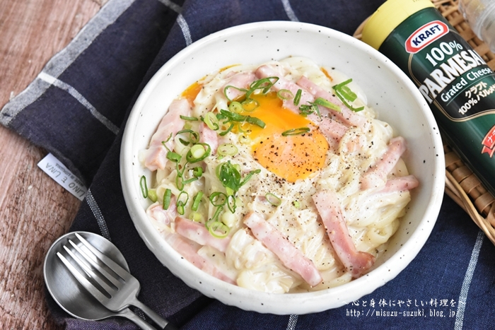 卵黄を絡めて食べればまるでカルボナーラ♪ 卵黄は後のせなので固まって失敗する事がなくなり、 お家で気軽にカルボナーラが味わえるのも、嬉しいところ。 ゆでうどんを使用していますので麺をゆでる時間が省け、 時短にもつながります。