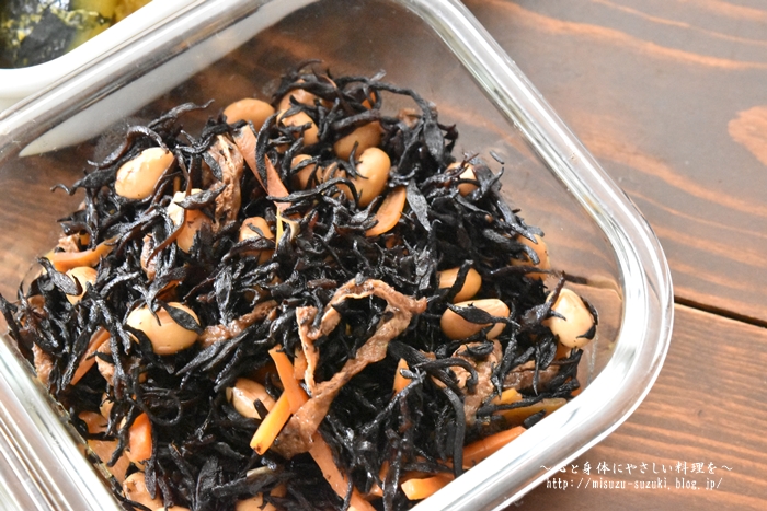 ひじきに大豆の水煮を入れると、栄養価がアップ。