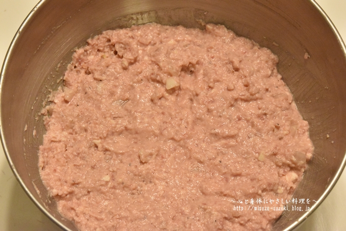 後は、合い挽き肉とみじん切りにした玉ねぎと