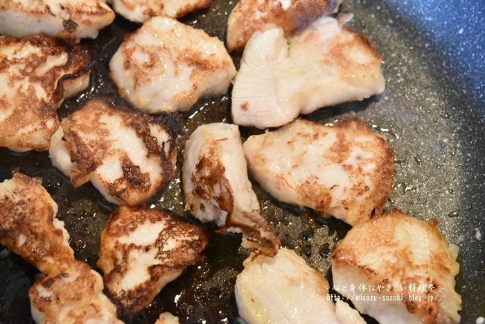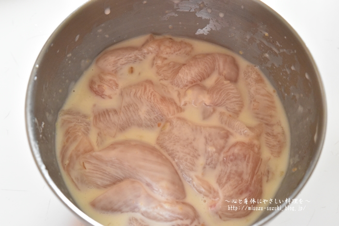 ①鶏むね肉は皮と脂を取り除き、斜め削ぎ切りの