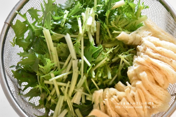 ①水菜は根元を切り良く洗い、食べやすい大きさに切る。油揚げは細切りにする。
