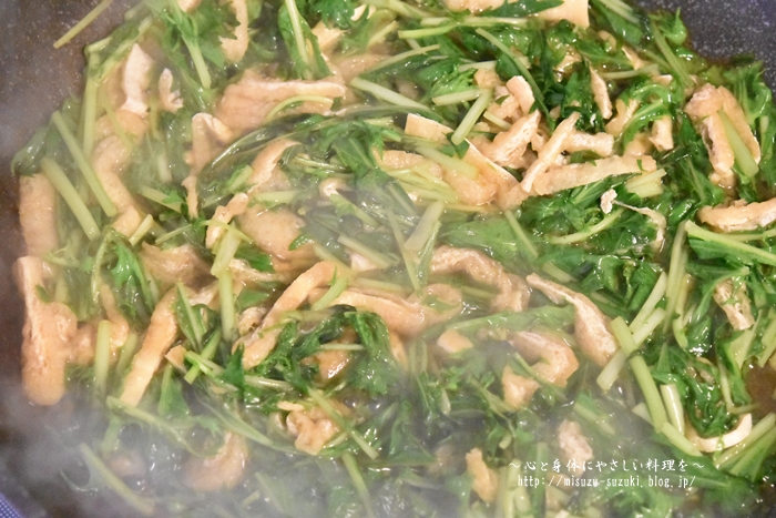 水菜と油揚げを入れ、しんなりするまで炒める。