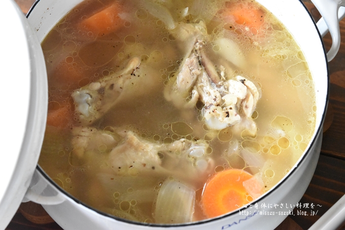沸騰したらアクを抜き、顆粒コンソメを加えやわらかくなるまで煮込み、