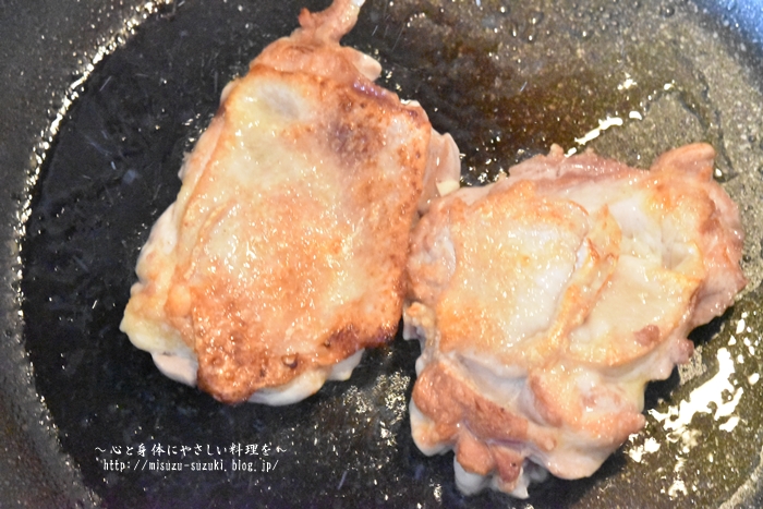 ・鶏もも肉の皮目はきつね色になるまで、じっくり焼いて下さいね。