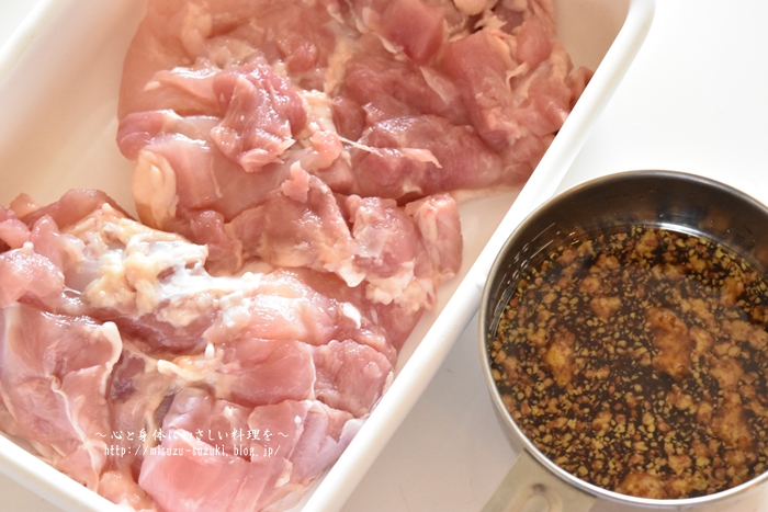 ①鶏もも肉は包丁で切り込みを入れて、厚みを均一にして半分に切る。