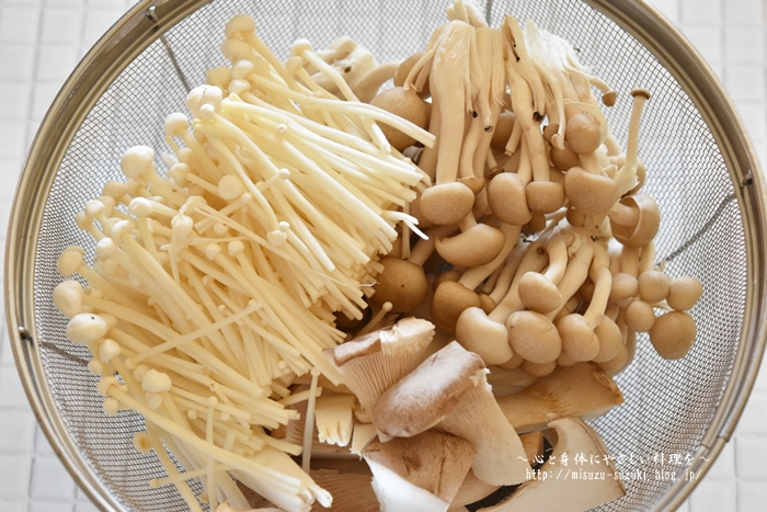 エリンギは食べやすい大きさに手でさき、えのきは石づきを取り手でさいて半分に切る。