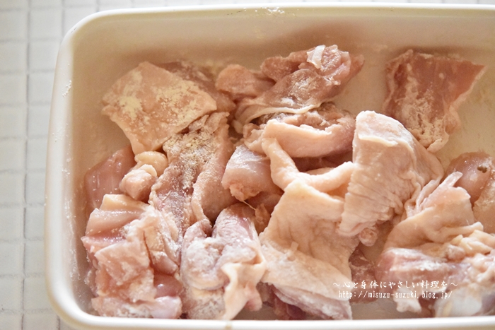 ・鶏もも肉に薄力粉をつける時、つけ残しがないようにまんべんなくつけて下さいね。