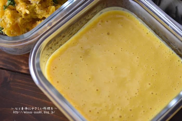 レンジ加熱してやわらかくなったかぼちゃを牛乳と一緒にミキサーにかけ、