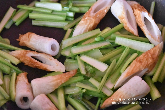 竹輪と小松菜の芯を入れてしんなりするまで炒める。