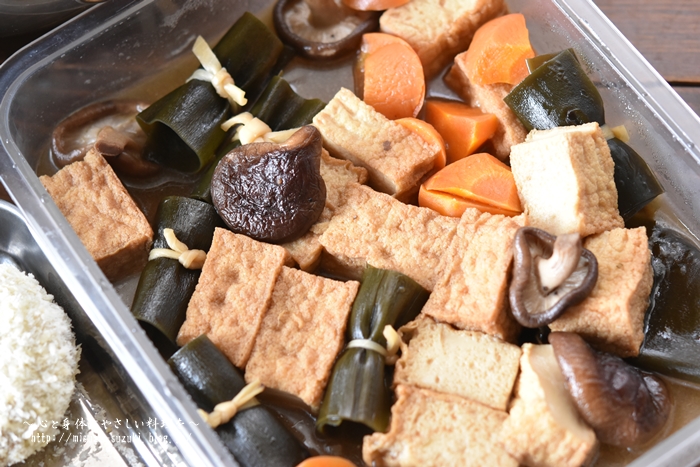 椎茸、人参、厚揚げ豆腐、昆布巻きをだし汁、お酒、みりん、醤油で炊きました。