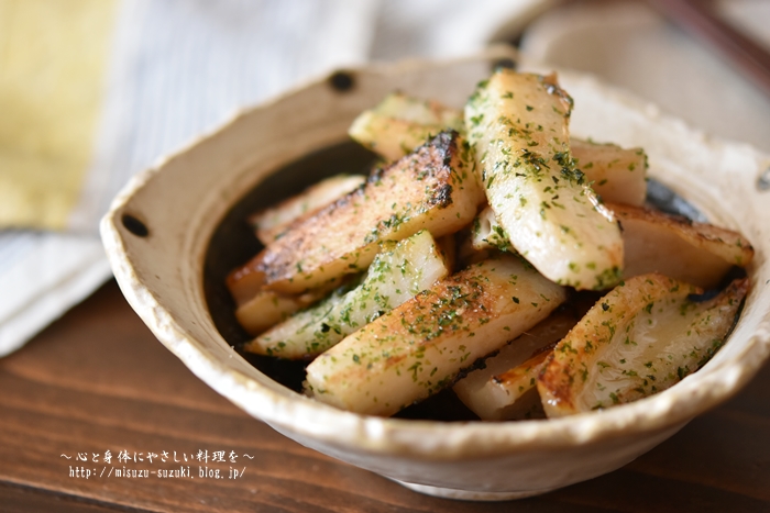 縦切りにして、ホクホクとシャキシャキの食感を味わいます。