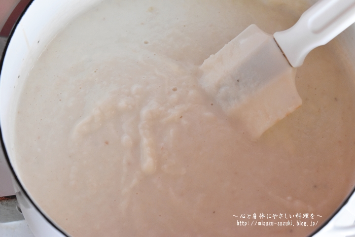 中火にかけて混ぜながら温め、沸騰寸前で火を止め塩こしょうで味を整える。