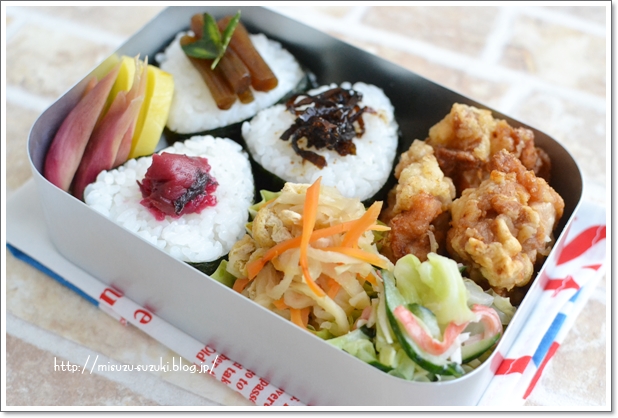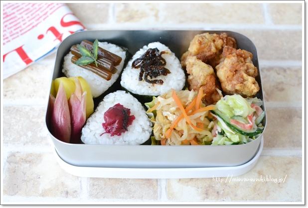 梅干し(自家製)、きゃらぶき(市販)、昆布(市販)をのせました。