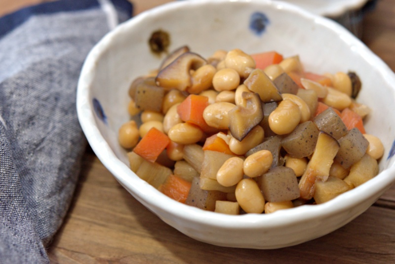 今日のレシピは家庭料理の定番、五目豆の煮物です。