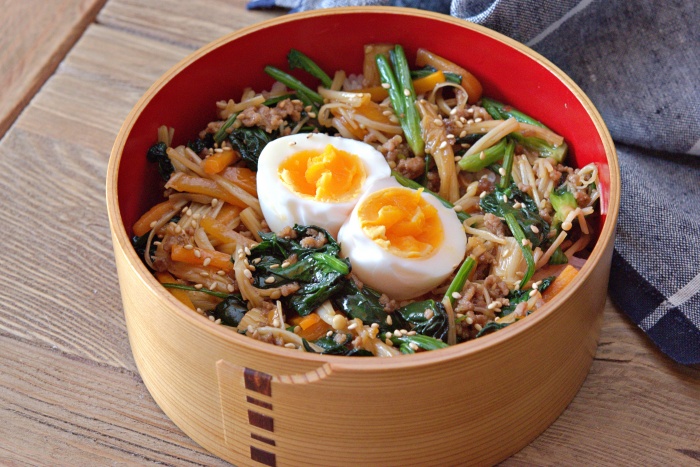 今日の動画は15分で作る、ビビンバ風丼べんとうです。 ビビンバといえば、ひとつひとつの食材をゆでて味付けをしてと 手間が掛かりますが、朝の忙しい時にそんな時間はない~~!! そんな時はフライパンで、具材をパパっと炒めるだけ。 そしてビビンバの味付けは調味料があれこれと必要になりますが、 たくさんの調味料を出して混ぜてと手間はかけたくない~~。 それなら焼肉のたれを使うと簡単に味が決まります。 そして、コチュジャンを加えるとグッと味が深まり、 本格的な味が楽しめますよ。 野菜もたっぷり摂れ、経済的なのでぜひお試し下さいね