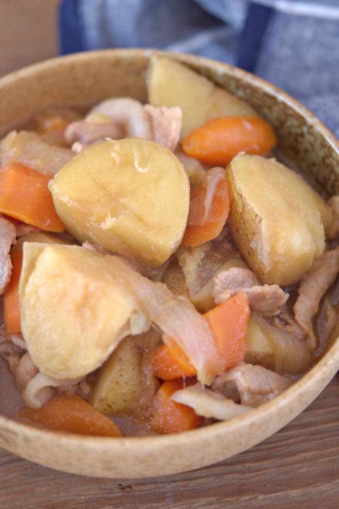 こちらからご覧になって下さいね。 【家庭料理の定番!豚バラ肉じゃが】 <材料・4人分> ・新じゃが 3個(約300g) ・新玉ねぎ 1個(約200g) ・人参 1本(約150g) ・豚バラ薄切り肉 200g ・サラダ油 小さじ1 ●水 300cc ●砂糖 大さじ1/2 ●酒・みりん・醤油 各大さじ2 ●顆粒だし 小さじ1 <作り方・調理時間30分> ①人参は皮をピーラーでむいて乱切りにして、 新じゃがは皮をつけたまま良く洗い、ひとくちサイズに切る ②新玉ねぎは皮をむき芯を取り、1cm厚さのクシ切りにする。 豚バラ薄切り肉は食べやすい大きさに切る。●を混ぜ合わせる ③フライパンにサラダ油をひき中火で熱し、 新玉ねぎを入れてしんなりするまで炒める ④ ③に新じゃがと人参を入れて2分炒め、 豚バラ薄切り肉を加えて火が通るまで炒める ⑤●を④に入れて落し蓋をして、沸騰したら蓋をして中火で15分煮る ⑥15分煮たら蓋と落し蓋を取り、 煮汁が少しになるまでフライパンを回しながら煮詰める <保存方法・保存期間> ・保存容器に入れ冷蔵保存で2日 <コツ・ポイント> ・ペーパーの真ん中に小さな穴を開けて具材の上に置くと、 落とし蓋の代わりになります ・アクが出たら取り除いて下さいね ・野菜はじっくり炒める事で、調味料の染み込みが良くなります ・15分煮た後で、煮詰めていくと調味料が具材にしっかり染み込むので調味料はわずかで済みます