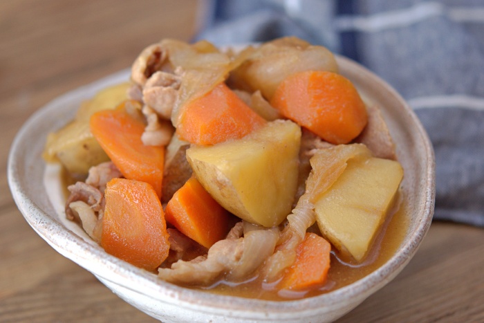 今日のレシピは、家庭料理の定番肉じゃがです。 お肉は豚バラ薄切り肉を使い、こってりとして ご飯が進む味付けにしました。 そして新じゃがと新玉ねぎを使いましたが、 普通のじゃがいもと玉ねぎでもお試しいただけます。 このレシピの特徴が、最後に煮詰めてしっかりと 調味料を具材に含ませる事です。 そうする事で調味料がわずかで済み、 しっかりと味が染み込んだ肉じゃがに仕上がります。
