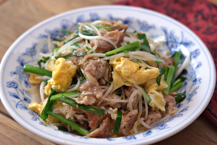 今日のレシピは、豚にらもやしの塩だれ卵炒めです。