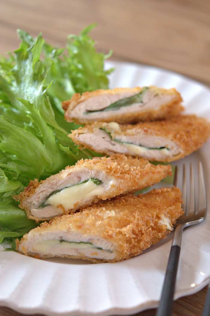 こちらからご覧になって下さいね。 【ささみの大葉チーズフライ】 <材料・2人分> ・ささみ 4本 ・大葉 4枚 ・スライスチーズ 2枚 ・塩こしょう 各少量 ・パン粉 適量 ・揚げ油 適量 ●薄力粉 大さじ4 ●水 大さじ5 <作り方・調理時間20分> ①スライスチーズはフィルムの上から半分に切り、大葉は茎を取る。 ●を混ぜ合わせる。パン粉をバットに入れる。 ②ささみはペーパーで水気を拭き取り、 筋と薄皮を取り除き観音開きにする ③ ②に大葉、スライスチーズの順にのせてたたみ、 両面に塩こしょうをふる。 ④ ③を●にくぐらせパン粉をつけ、 180度の揚げ油に入れきつね色になったら裏返し中火にして2分揚げ、 バットに上げて油をきる。 <コツ・ポイント> ・③の工程ではささみをたたんだ時、スライスチーズがはみ出ないようにして下さいね