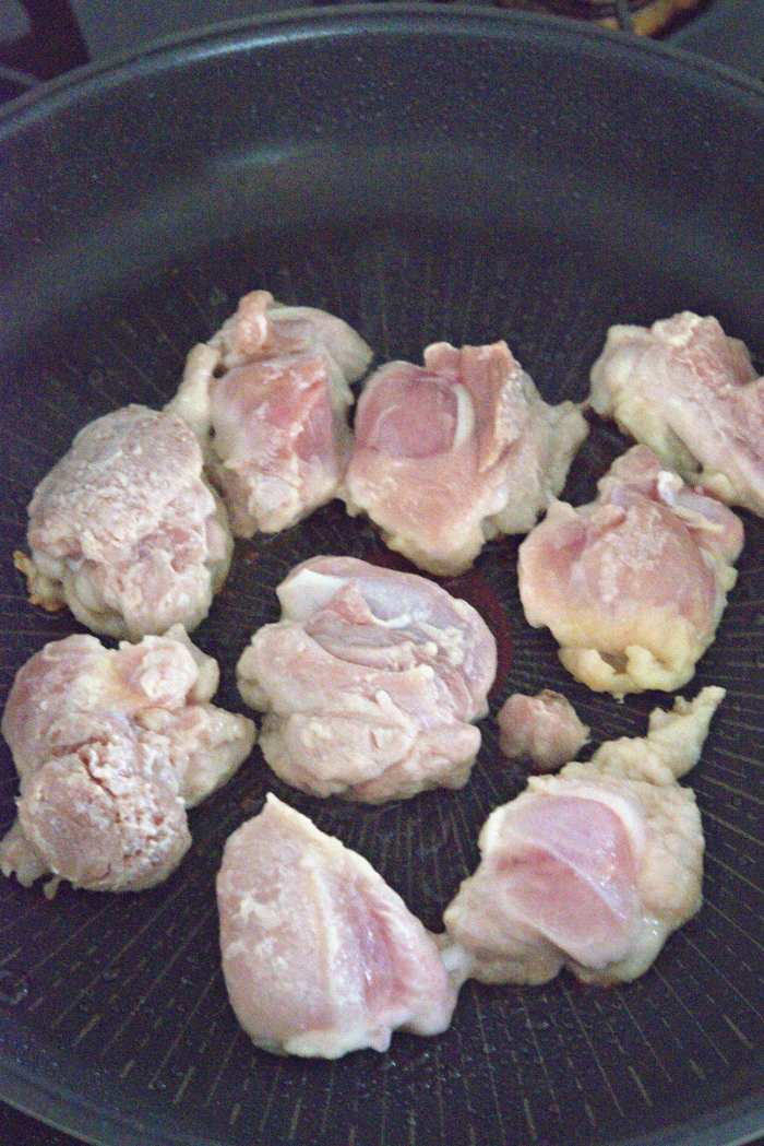 鶏もも肉の皮目を下にして並べ、焼き色がつくまで焼く。