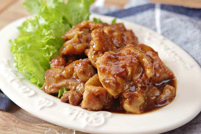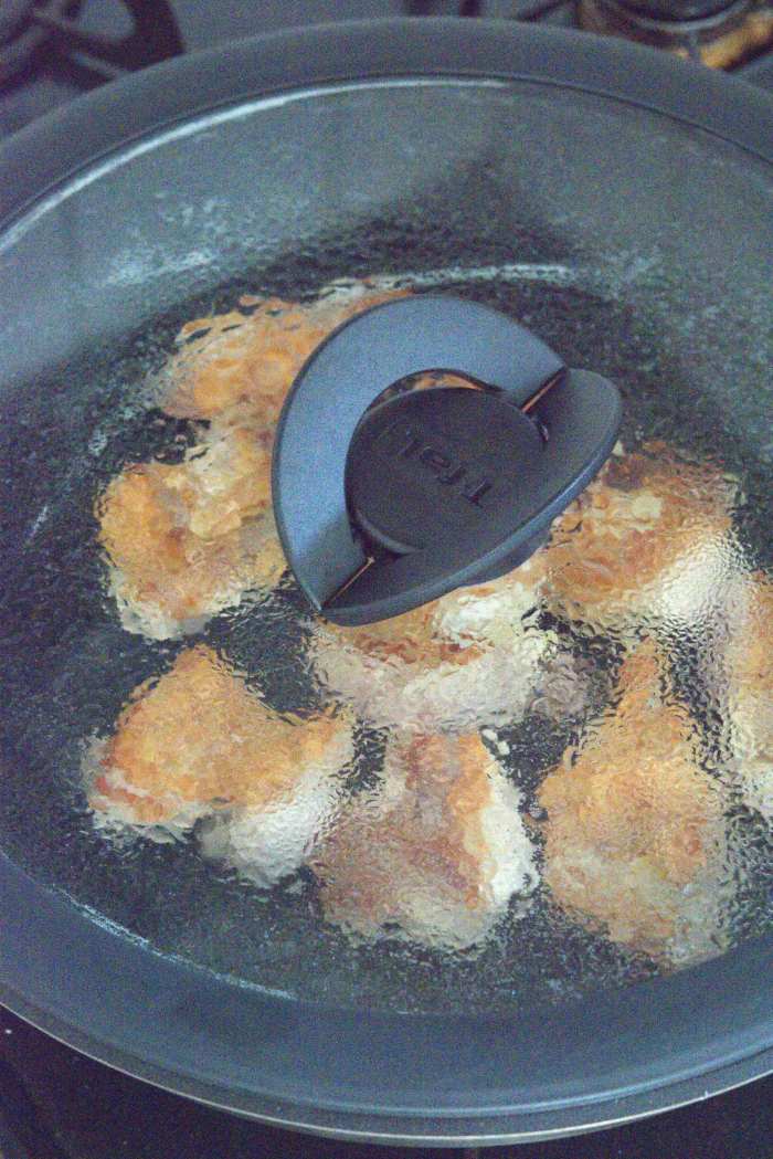④蓋を取り●を加え、フライパンをゆすりながら鶏もも肉にたれを絡める。