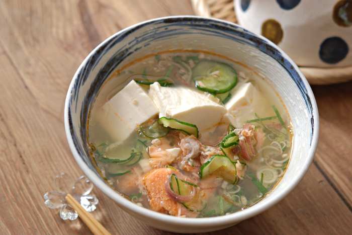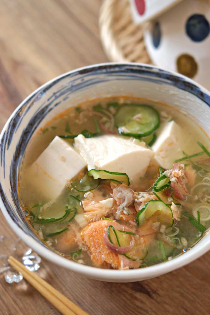 今回の動画は家庭料理の定番、冷や汁レシピのご紹介です。 冷や汁は私が子供の頃、母が良く作ってくれた懐かしい料理です。 たんぱく質豊富で薬味がたっぷり入っていますので、 暑い時期にとっても食べやすいので食欲がない時でも、 サラサラっといただけますよ。 昔ながらの料理は、ココロとカラダが元気になる要素がいっぱい!! ぜひ!最後までご覧になって下さいね。 【焼き鮭と薬味たっぷり冷や汁】 <材料・2人分> ・塩鮭 2切れ ・きゅうり 1/2本 ・木綿豆腐 1/2丁(150g) ・みょうが 1本 ・大葉 2枚 ●水 500cc ●白だし・酒・みりん 各大さじ1 ★味噌 大さじ2 ★砂糖 小さじ1 <作り方・調理時間30分> ①塩鮭は魚焼きグリルで焼いて、骨と皮を外してほぐす。 ②アルミホイルを広げてその上で★を混ぜて平らにして、 焼き色がつくまでトースターで焼く。 ③鍋に●を入れて火にかけ、沸騰したら火を止め②を溶かし、 手でちぎった木綿豆腐を入れる。 ④きゅうりは薄い輪切りにして塩をふり、 しんなりするまで置いておきしんなりしたら水気を絞る。 ⑤みょうがは根元を切り、薄い輪切りにしてほぐす。 大葉は茎を取り細かく切る。 ⑥ ③に①④⑤を加え、冷蔵庫で冷やす。 <コツ・ポイント> ・白だしの代用はだしの素(小さじ1)など顆粒のものを使って下さいね