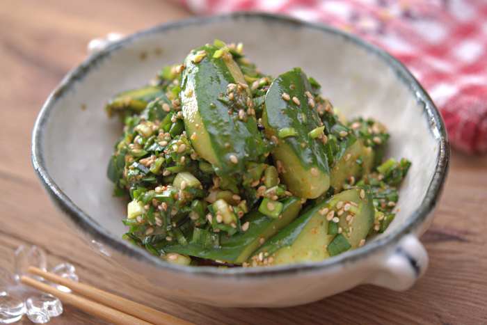 【きゅうりとにらのピリ辛漬け】 <材料・2人分> ・きゅうり 1本 ・にら 1/2束 ・塩 ひとつまみ ●粉唐辛子 小さじ1/2 ●砂糖・酢・すりおろしにんにく 各小さじ1 ●醤油・ごま油 各小さじ2 ●いりごま 大さじ1 <作り方・調理時間10分・冷蔵庫で冷やす時間を除く> ①きゅうりはヘタを切りピーラーで縞目に皮をむき、 乱切りにしてポリ袋に塩と一緒に入れ、 ポリ袋に空気を入れて上下にふる。 ②にらは洗って水気をきり細かく刻んで、 ①へ入れて●を加え良く揉み込み冷蔵庫で1時間冷やす。 <コツ・ポイント> ・ひとつまみとは、親指、人差し指、 中指の3本の指で軽く摘んだ量になります。 ・粉唐辛子は七味を使用しました。 一味や韓国の粉唐辛子などお好みのものでお試し下さいね