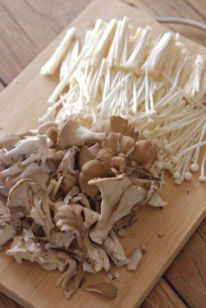 舞茸は小房に分け、しめじは石づきを取り小房に分ける。