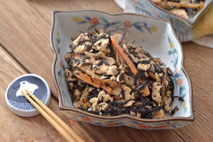 【ひじきとさつま揚げの炒り豆腐】 <材料・4人分> ・生ひじき 150g ・さつま揚げ 2枚 ・人参 1/3本(約50g) ・木綿豆腐 1丁(300g) ・サラダ油 小さじ1 ・ごま油 小さじ1 ●酒・みりん・醤油 各大さじ2 ●白だし 大さじ1 ●水 100cc <作り方・調理時間25分> ①木綿豆腐は容器の中の水を捨てる。●を混ぜ合わせる。 ②生ひじきはザルに上げ、サッと洗って水気をきる。 さつま揚げは細切り、人参は洗って縦に薄切りにして、 何枚か重ね細切りにする。 ③フライパンにサラダ油をひき中火で熱し、 さつま揚げと人参を入れて人参がしんなりするまで炒める。 ④ ③に木綿豆腐、生ひじきを加え3分ほど炒め、 ●を加え沸騰したら蓋をして少しずらし中火で5分煮る。 ⑤5分煮たら蓋を開け、強火にして炒めながら煮汁を飛ばし、 煮汁がほぼなくなるまで炒り、ごま油を加え炒め合わせる。 <保存方法・保存期間> ・保存容器に入れ冷蔵保存で2日 <コツ・ポイント> ・乾燥ひじきを使用する場合は、 約2gをお水で戻してから調理して下さいね ・⑤の工程では、煮汁をしっかり飛ばさないとベチャッとした仕上がりになりますので、