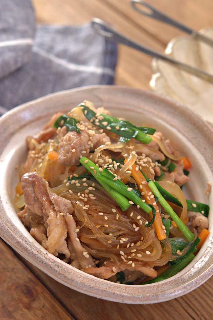 【豚こま春雨のコク旨チャプチェ】 <材量・2~3人分> ・豚こま切れ肉 200g ・緑豆春雨 40g ・玉ねぎ 1/2個(約150g) ・人参 1/3本(約50g) ・にら 1/2束 ・ごま油 小さじ1 ・いりごま 少量 ●片栗粉 大さじ1/2 ●酒 大さじ1 ★水 100cc ★酒・みりん・醤油・オイスターソース 各大さじ1 ★鶏がらスープの素・すりおろしにんにく 各小さじ1 <作り方・調理時間25分> ①豚こま切れ肉に●を揉み込む。 ★を混ぜ合わせる。 玉ねぎは薄切りに、人参は細切り、にらは食べやすい長さに切る。 ②フライパンにごま油をひき中火で熱し、 豚こま切れ肉を入れ焼き色がつくまで焼き、 焼き色がついたら裏返しフライパンの隅に寄せる ③人参、玉ねぎを加え、玉ねぎがしんなりするまで炒め、 緑豆春雨、★を加え蓋をして4分蒸し煮にする。 ④4分蒸し煮にしたらにらを加え、 サッと炒め合わせ器に盛り付けいりごまをふる。 <コツ・ポイント> ・お好みでラー油をかけると、また違った味わいが楽しめます ・豚こま切れ肉はフライパンに入れる時、塊があれば広げるようにして下さいね