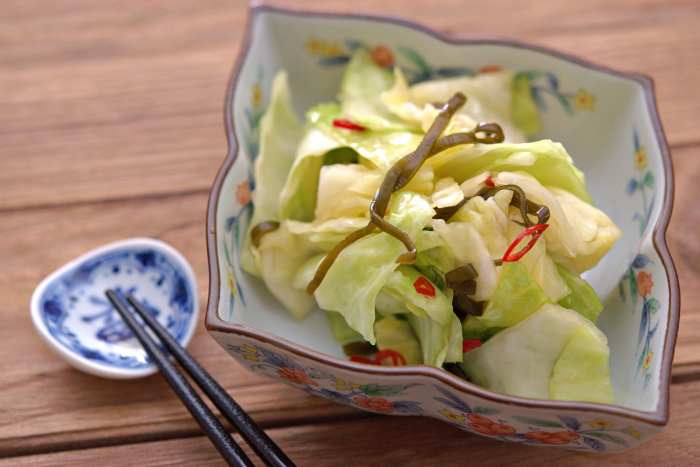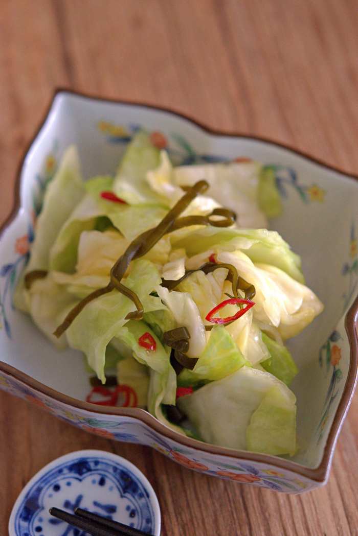 【春キャベツのキャベツの浅漬け】 <材料・作りやすい分量> ・春キャベツ 1/4玉(約350g) ・塩 小さじ1/2 ・鷹の爪 1本 ・だし昆布 3g ・白だし 小さじ1 <作り方・調理時間10分・寝かせる時間を除く> ①春キャベツは芯を切り、 ザク切りにしてザルに入れてサッと洗い水気をきる。 ②①をジッパー付きの袋に入れ、 塩を振り入れジッパー付きの袋に空気を入れ、 上下左右に振って春キャベツに塩をなじませる。 ③鷹の爪は種を取り出し、小口切りにする。 だし昆布は細かく切る。 どちらもキッチンバサミで切るといいですよ。 ④ジッパー付きの袋に③と白だしを加え、 ジッパー付きの袋に空気を入れ上下左右に振って、 全体になじませ空気を抜いて口を閉じる。 ⑤ジッパー付きの袋はバットなどに置き、 上に重しになるものをのせ冷蔵庫に入れ1日寝かせる。 <コツ・ポイント> ・冷蔵庫の中で寝かせている時、時々取り出して揉み込んだり、 上下を返して重しをかけて寝かしたりして下さいね。 <保存方法・保存期間> ・ジッパー付きの袋に入れたまま冷蔵保存で4日