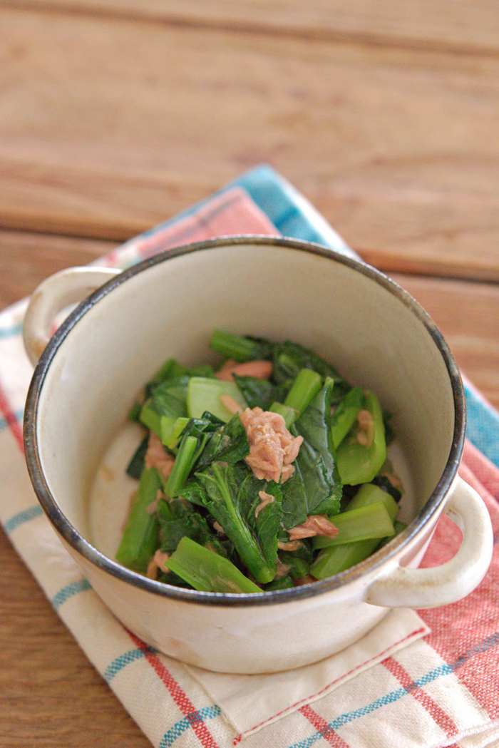 【小松菜とツナの和え物】 小松菜は少量なのでレンジで簡単に作ります。 ツナが入るので食べ応えがあるおかずです。