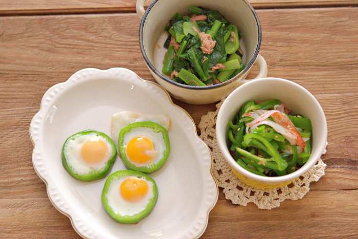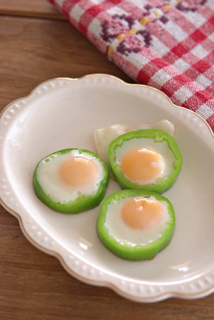 【ピーマンとうずらの卵の目玉焼き】 これは長女が幼稚園の時に流行ったおかずで、 見た目もかわいくてひとくちサイズなので食べやすいよ。 これは卵焼き器で焼くだけ。