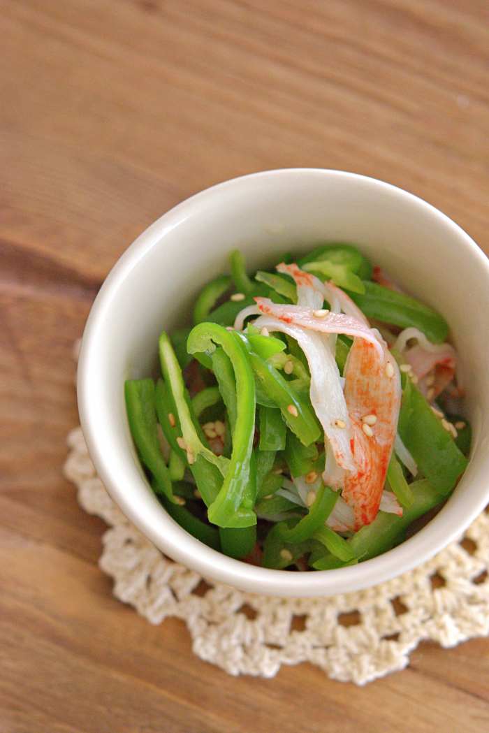 【ピーマンとかにかまの白だし和え】 こちらもレンジを使ってパパっとできるので、 忙しい朝には助かります。 そしてかにかまの赤が入るので、彩りがとてもキレイです。