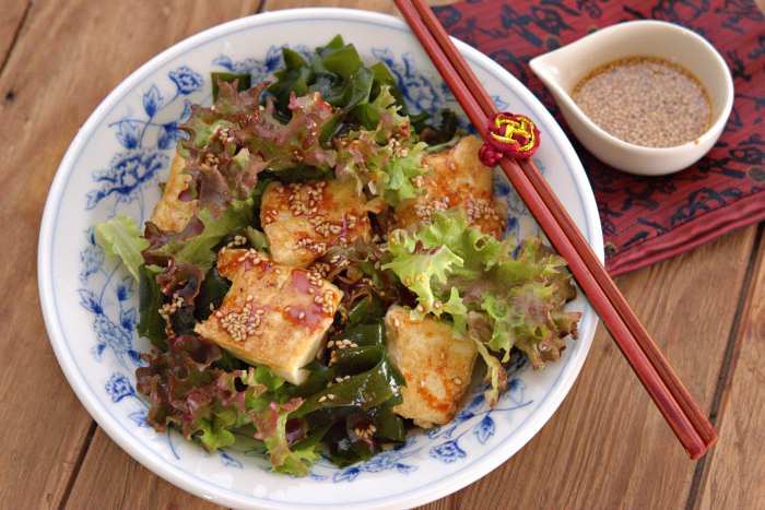 【カリッと豆腐のチョレギサラダ】 <材料・2人分> ・木綿豆腐 1/2丁(150g) ・サニーレタス 4〜5枚(約80g) ・生わかめ 60g ・片栗粉 大さじ2 ・ごま油 大さじ1 ●砂糖・いりごま・ごま油・酢・コチュジャン 各大さじ1 ●醤油 大さじ1/2 ●すりおろしにんにく 小さじ1 <作り方・調理時間15分> ①木綿豆腐は手で一口大にちぎり、ペーパーの上に置いて水気をきる。 ②サニーレタスは洗って食べやすい大きさに手でちぎり、 パリッとするまで冷水に浸して水気をきる。 ③生わかめは洗って水気を絞り、食べやすい大きさに切る。 ●を混ぜ合わせる。 ④木綿豆腐に片栗粉をまんべんなくまぶす。 フライパンにごま油をひき中火で熱し、 片栗粉をまぶした木綿豆腐を並べる。 ⑤木綿豆腐は全体に焼き色がつくまで、上下を返しながら焼く。 ⑥器にサニーレタス、生わかめ、木綿豆腐を盛り付け、 食べる直前に●をかける。 <コツ・ポイント> ・片栗粉は、つけ残しがないようにまんべんなくつけて下さいね。 ・豆腐を焼く時、あまり触らないでじっくり焼いて下さいね。