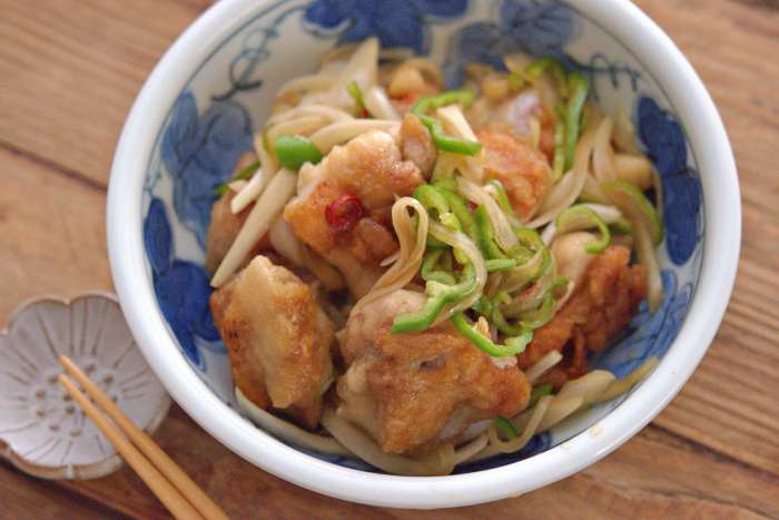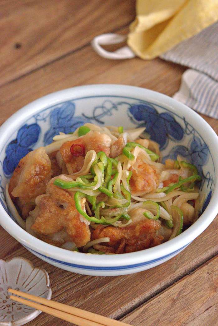 【新玉ねぎとチキンの南蛮漬け】 <材料・2人分> ・鶏もも肉 1枚(約300g) ・新玉ねぎ 1/2個(約100g) ・ピーマン 1個 ・サラダ油 大さじ1 ・片栗粉 大さじ2 ・塩 少量 ●酢 100cc ●砂糖・水・醤油 各大さじ2 ●みりん 大さじ1 ●鷹の爪 1本 <作り方・調理時間20分> ①耐熱ボウルに●を入れて混ぜ合わせ、 薄切りにした新玉ねぎを入れラップをふんわりかけ、 600wで2分レンジで加熱する。 ②鶏もも肉はペーパーで水気を拭き取り一口大に切り、 塩を振って揉み込み両面に片栗粉をまんべんなくまぶす。 ③フライパンにサラダ油をひき中火で熱し、 鶏もも肉の皮目を下にして焼き色がつくまで焼き、 裏返したら中火で5分焼く。 ④鶏もも肉を焼いている間に、 ピーマンは縦半分に切り種を取り細切りにして①へ加えて、 良く混ぜ合わせる。 ⑤鶏もも肉が焼けたら油をきって、④へ浸す。 <コツ・ポイント> ・鶏もも肉にしっかり焼き色をつけて下さいね ・できたてよりも、1時間以上浸すとより美味しくなります