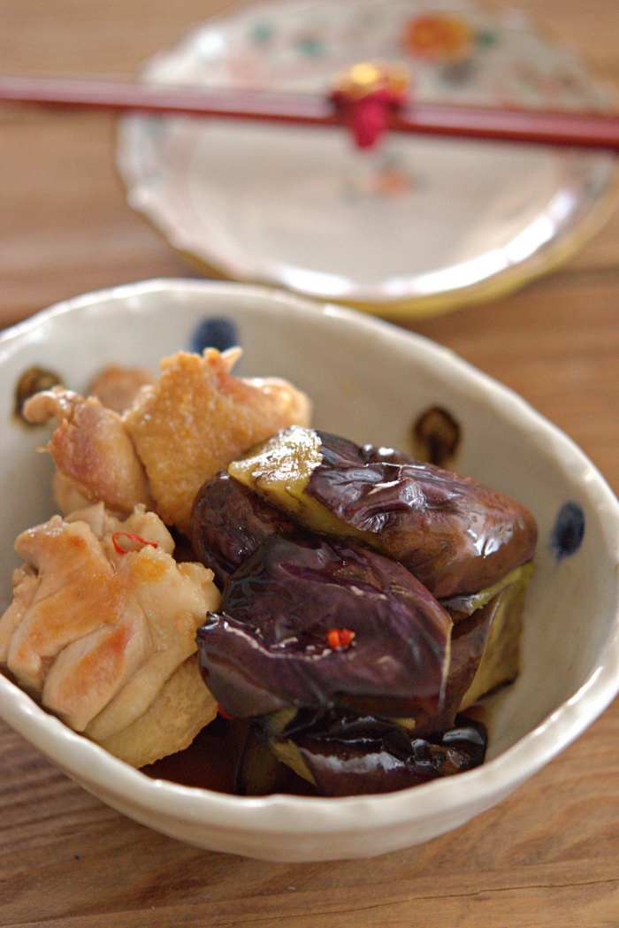 【なすと鶏もも肉の甘酢漬け】 <材料・2人分> ・鶏もも肉 1枚(約250g) ・なす 2本(約200g) ・ごま油 大さじ1 ・鷹の爪 少量 ●砂糖・水・醤油 各大さじ2 ●みりん 大さじ1 ●酢 100cc <作り方・調理時間15分> ①鶏もも肉はペーパーで水気を拭き取り、筋があれば取り除き、 一口大に切る。なすはヘタを切り、一口大の乱切りにする。 ②フライパンにごま油をひき中火で熱し、 鶏もも肉の皮目を下にして並べ焼き色がつくまで焼く。 ③●を耐熱容器に入れてラップをふんわりかけ、 600wで40秒レンジで加熱する。 ④鶏もも肉に焼き色がついたら裏返してフライパンの隅に寄せ、 なすの皮目を下にして並べなすに焼き色がつくまで焼く。 ⑤なすの皮目に焼き色がついたら裏返し、 しんなりするまで焼き、甘酢だれに入れて浸す。 <コツ・ポイント> ・できたてよりも、2時間以上浸すとより美味しくなります ・鶏もも肉の皮目はしっかり焼き色がつくまで焼いて下さいね <保存方法・保存期間> ・保存容器に入れ冷蔵保存で3日