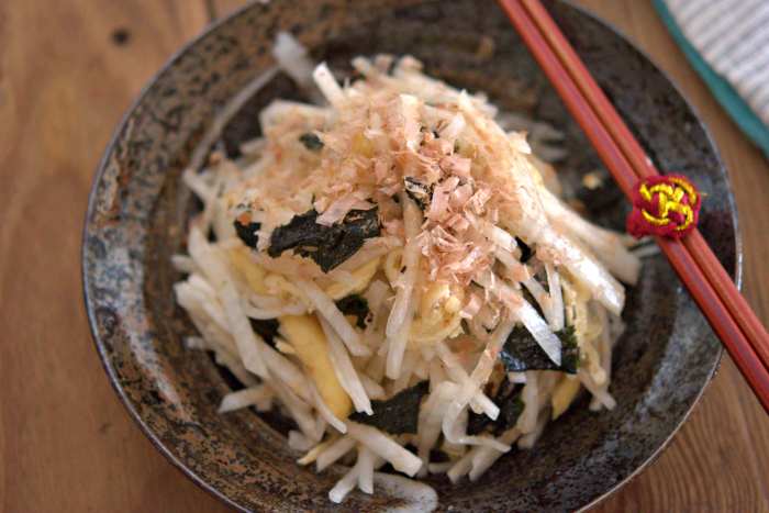 【梅ドレッシングの和風大根サラダ】 <材料・2~4人分> ・大根 300g ・油揚げ 1枚 ・海苔 全形1枚 ・かつお節 適量 ●梅肉 小さじ2 ●みりん・オリーブオイル 各大さじ2 ●白だし 大さじ1 <作り方・調理時間15分> ①大根は皮をむいて細切りにして、 氷水に5分浸してパリッとしたらザルに上げて水気をきる。 ②梅干しは種を取り出し、包丁で叩いて梅肉にする。 少し大きめのボウルに●を混ぜ合わせる。 ③油揚げは細切りにして、 中火で温めたフライパンに入れてカリッとするまで焼く(油は不要です) ④●に大根、油揚げを入れコンロで両面を炙った海苔をちぎって加え、良く混ぜ合わせる。 <コツ・ポイント> ・梅ドレッシングと大根を混ぜ合わせる時、