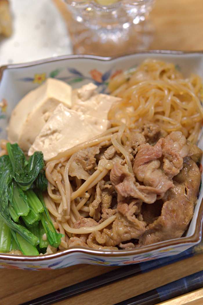 牛薄切り肉、しらたき、木綿豆腐、たっぷりのえのきを、