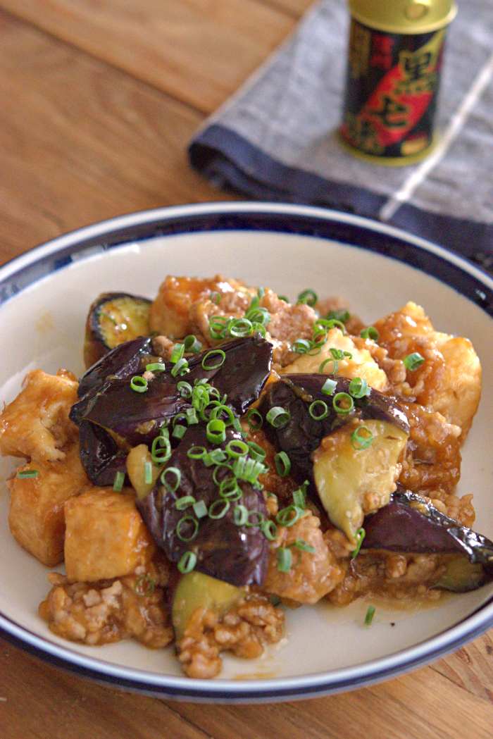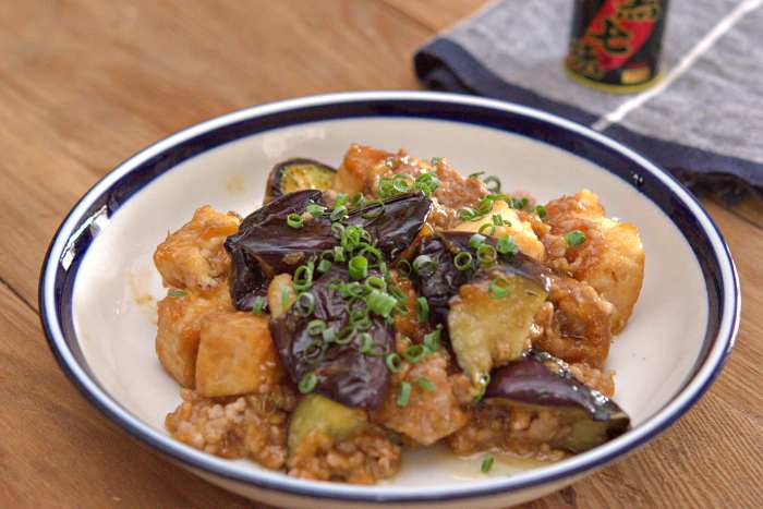 【なすと厚揚げ豆腐の肉味噌あん】 <材料・2人分> ・なす 1本(約170g) ・厚揚げ豆腐 1枚(約140g) ・豚ひき肉 100g ・サラダ油 大さじ2 ・刻みネギ 少量 ●片栗粉 小さじ2 ●砂糖・すりおろしにんにく 各小さじ1 ●味噌・酒・みりん・醤油 各大さじ1 ●水 大さじ2 <作り方・調理時間20分> ①●を混ぜ合わせる。なすは洗ってヘタを切り、 一口大の乱切りにする。 ②フライパンにサラダ油をひき中火で熱し、 なすの皮目を下にして並べ、 厚揚げ豆腐は一口大になるように手でちぎって並べて焼く。 ③なすの皮目に焼き色がついたら裏返し、2分ほど焼く。 厚揚げ豆腐は上下を返しながら全体に焼き色をつける。 ④なすを2分焼いたら、厚揚げ豆腐となすをフライパンの隅に寄せ、 豚ひき肉を加え火が通るまで炒める。 ⑤豚ひき肉に火が通ったら、●を加えフライパンをゆすりながら全体に絡め、