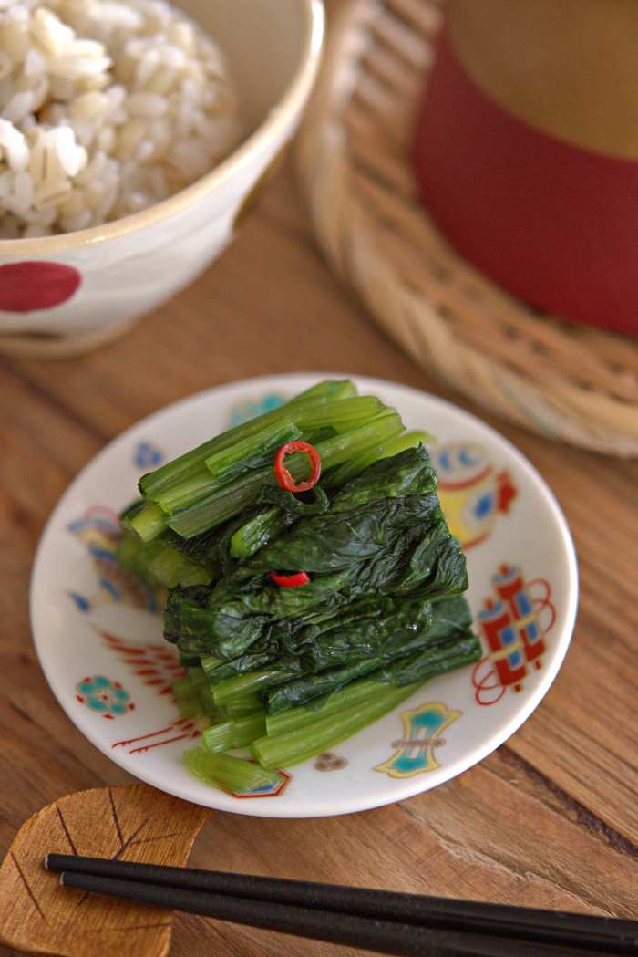 【小松菜の野沢菜漬け風】 <材料・作りやすい分量> ・小松菜 1袋(約200g) ・塩 小さじ1/4 ●砂糖 小さじ1 ●白だし 大さじ1 ●鷹の爪 少量 <作り方・調理時間7分・漬け込む時間を除く> ①小松菜は根元を切り、葉と芯の部分に切り分けそれぞれを良く洗う。