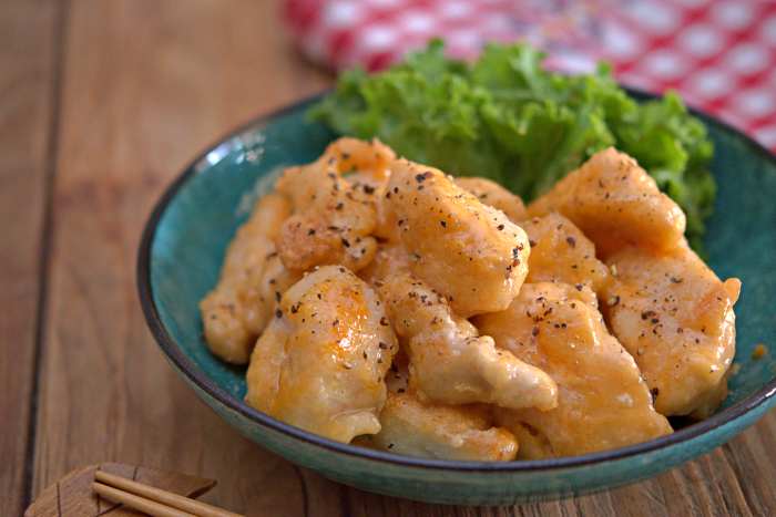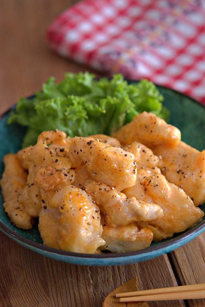 【鶏むね肉で鶏マヨ】 <材料・2人分> ・鶏むね肉 1枚(約250g) ・片栗粉 大さじ4 ・サラダ油 大さじ2 ●塩 ひとつまみ ●砂糖 小さじ1/2 ●酒 小さじ2 ★マヨネーズ 大さじ3 ★ケチャップ 大さじ1 ★酢・はちみつ 各小さじ1 <作り方・調理時間15分・漬け込む時間を除く> ①鶏むね肉は皮を取り、ペーパーで水気を拭き取り縦半分に切り、 1cm厚さの斜め切りにして、それを縦半分の棒状に切る。 ②①をポリ袋に入れ●を加えて良く揉み込み、5分置いておく。 その間に★を混ぜてたれを作る。 ③ポリ袋に片栗粉を加え、ポリ袋に空気を入れて上下左右にふって、 片栗粉をまんべんなくつける。 ④フライパンにサラダ油をひき中火で熱し、 フライパンが温まったら③を並べて焼き色がつくまで焼く。 ⑤焼き色がついたら裏返し、中火で2分焼き火を止め、 ペーパーで油を拭き取り★を加えて手早く絡める。 ⑥器に盛り付け、お好みで粗びきこしょうをふる。 <コツ・ポイント> ・片栗粉をつけ残しがないように、まんべんなくつけて下さいね (つけ残しがあるとカリッと仕上がらなくなります)