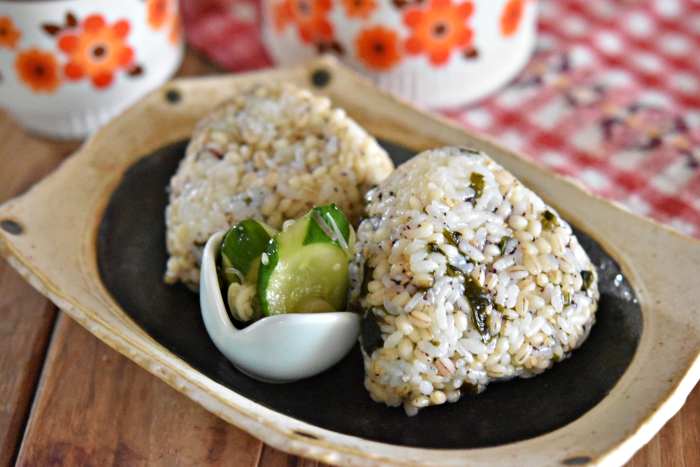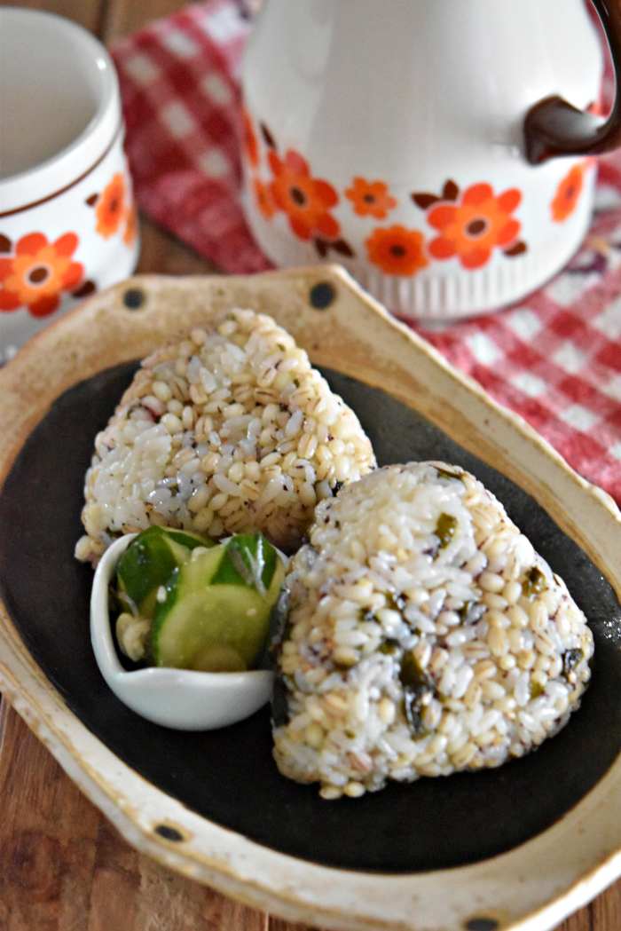 もち麦入りのおにぎりで、味付けは白だしベースに