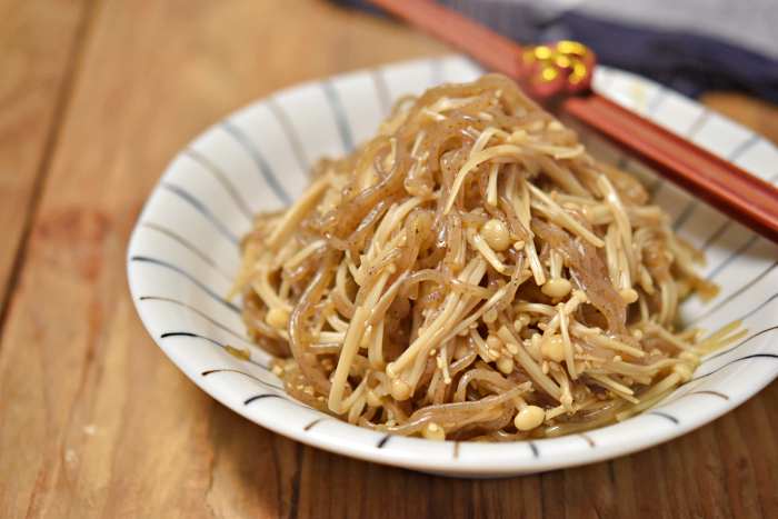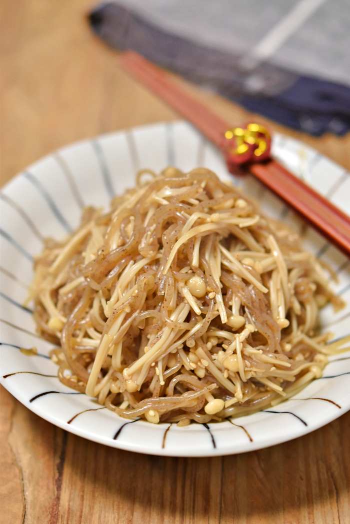 【しらたきとえのきの炒り煮】 <材量・4人分> ・しらたき 1袋(200g) ・えのき 1袋(200g) ・ごま油 小さじ1 ・いりごま 大さじ1 ●酒・みりん・醤油・白だし・水・オイスターソース 各大さじ1 ●砂糖 小さじ1 <作り方・調理時間15分> ①しらたきはザルに上げて洗い、 キッチンバサミで食べやすい長さに切る。 ②えのきは石づきを切り、 根元に包丁で切り込みを入れてほぐし半分に切る。 ③●を混ぜ合わせる。 ④フライパンを中火にかけ温まったら、 しらたきを入れ乾いた音になるまで乾炒りにする。 ⑤しらたきが乾いた音になったら、 えのきとごま油を加えてえのきがしんなりするまで炒める。 ⑥えのきがしんなりしたら、 ●を加えて汁気がなくなるまで炒めながら煮詰めいりごまをふる。 <コツ・ポイント> ・しらたきは乾炒りをする事で余分な水分が抜け、 下茹でをする手間が省けます。 ・⑥の工程では汁気がなくなるまで 煮詰めると食材に調味料が染み込みやすくなるので、 火加減に気を付けながら煮詰めて下さいね。