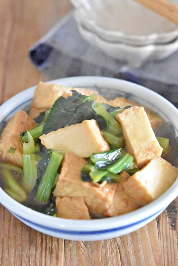 【小松菜と厚揚げ豆腐のガーリック煮】 <材量・3~4人分> ・小松菜 1束(約200g) ・厚揚げ豆腐 2枚(約270g) ・にんにく 2片 ・サラダ油 大さじ1 ●水 200cc ●鶏がらスープの素 小さじ1/2 ●酒・みりん・醤油 各大さじ1 <作り方・調理時間20分> ①小松菜は根元を切り良く洗って、食べやすい長さに切る。 芯と葉の部分は分けておくと調理がスムーズに進みます。 ②厚揚げ豆腐は一口大に切る。にんにくは皮をむいて薄切りにする。 ●を混ぜ合わせる。 ③フライパンにサラダ油とにんにくを入れ弱火にかけ、 にんにくの香りが出るまで加熱する。 ④にんにくの香りが出たら、 厚揚げ豆腐を入れ上下を返しながら焼き色をつけ、 小松菜の芯を加えしんなりするまで炒める。 ⑤小松菜の芯がしんなりしたら、 小松菜の葉の部分を入れしんなりするまで炒め、 ●を加え沸騰したら蓋をして中火で5分煮る。 ⑥5分煮たら蓋を取り、強火にして1分煮詰めてできあがり!! <コツ・ポイント> ・厚揚げ豆腐に焼き色がつくまでじっくり焼く事で、 香ばしくなり旨味が増します <保存方法・保存期間> ・保存容器に入れ冷蔵保存で2日