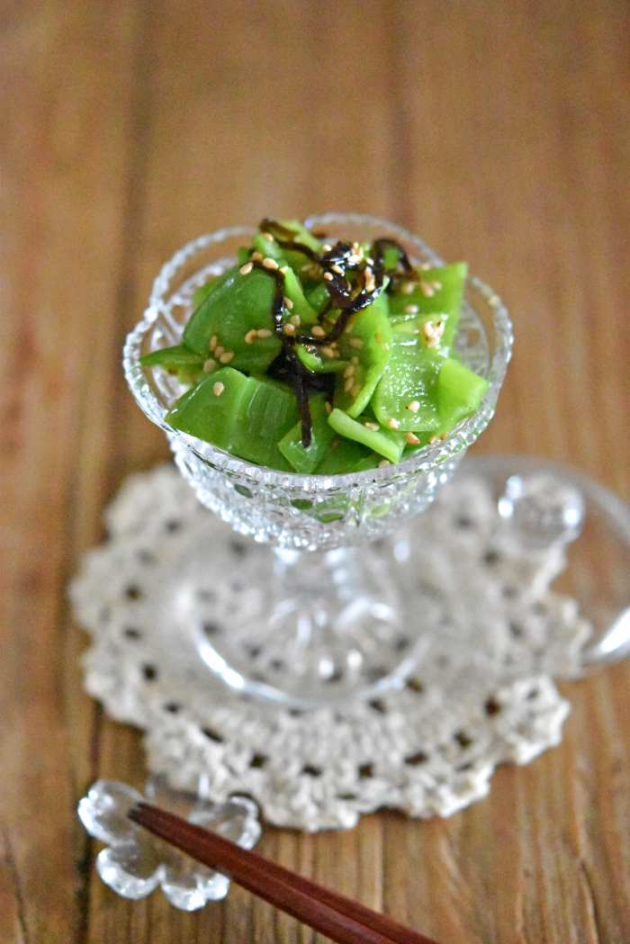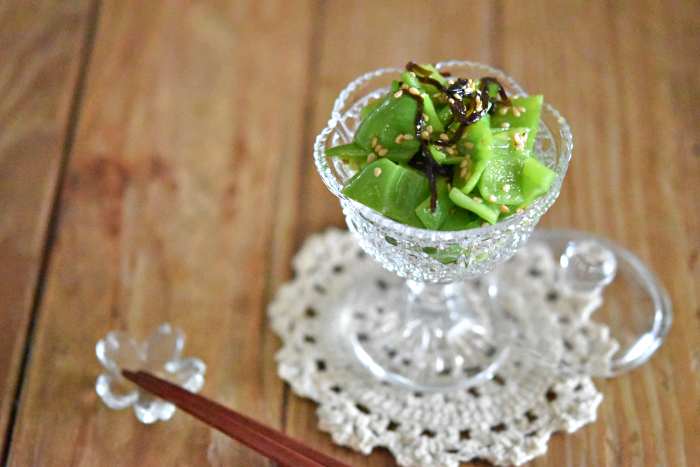【やみつき塩昆布ピーマン】 <材料・4人分> ・ピーマン 5個 ●塩昆布 5g ●ごま油・すりおろしにんにく 各小さじ1 ●砂糖 ひとつまみ <作り方・調理時間10分> ①ピーマンは洗って縦半分に切り、種とワタを取り除き細かく切る。 ② ①を耐熱容器に入れラップをふんわりかけ、 600w1分30秒レンジで加熱してペーパーで水気を拭き取る。 ③②に●を加え良く混ぜ合わせる。 <コツ・ポイント> ・ペーパーで水気を拭き取る時は、 熱いのでやけどしないように気を付けて下さいね。